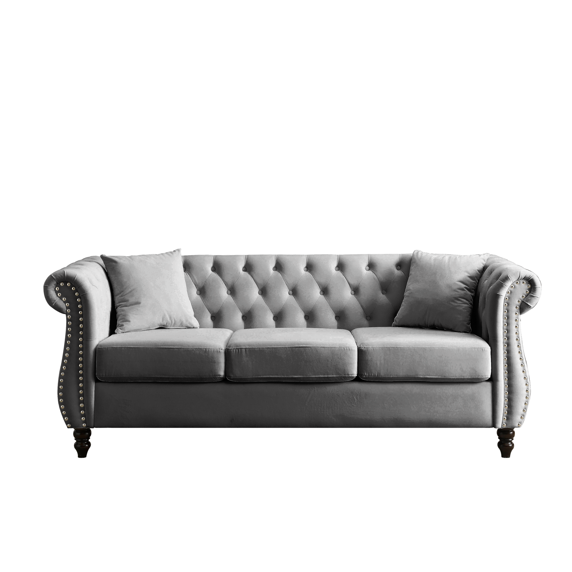 - Classic Chesterfield style with rolled arms and tufted buttons