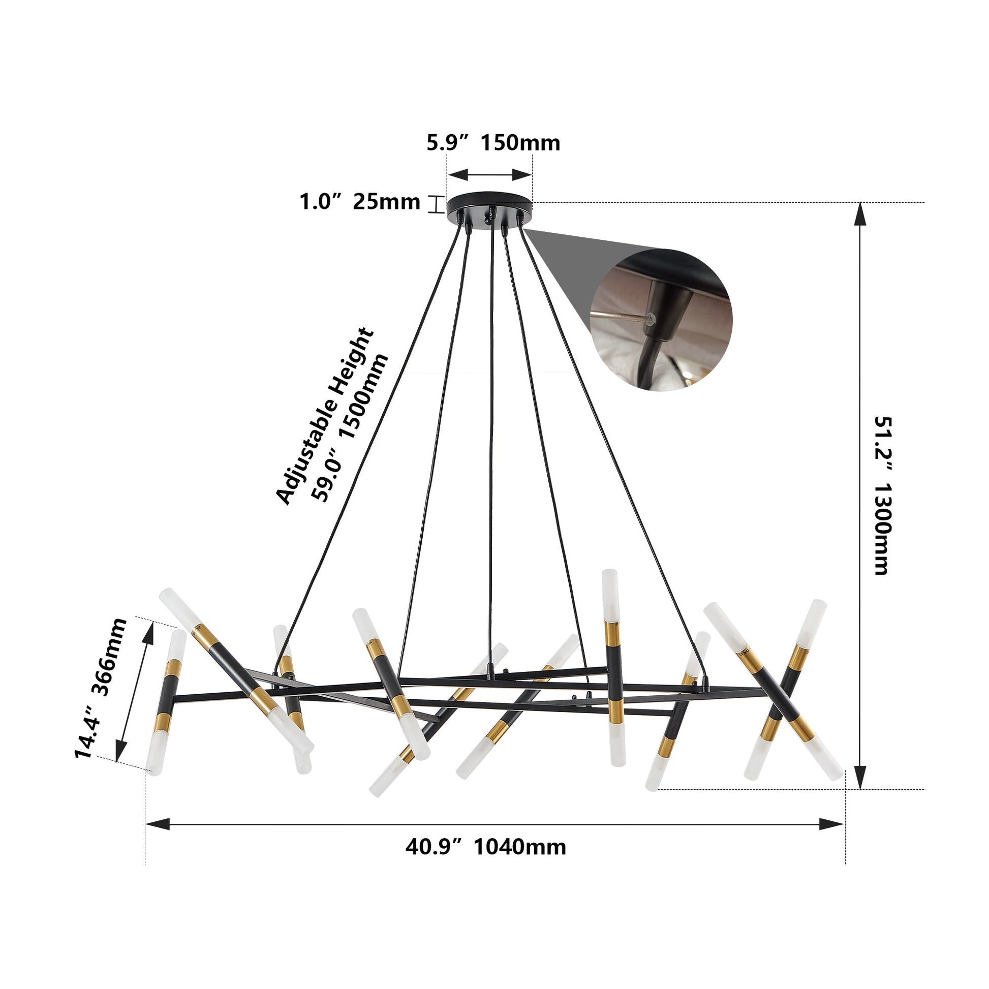 - Black suspension cords with adjustable height to suit various ceiling heights